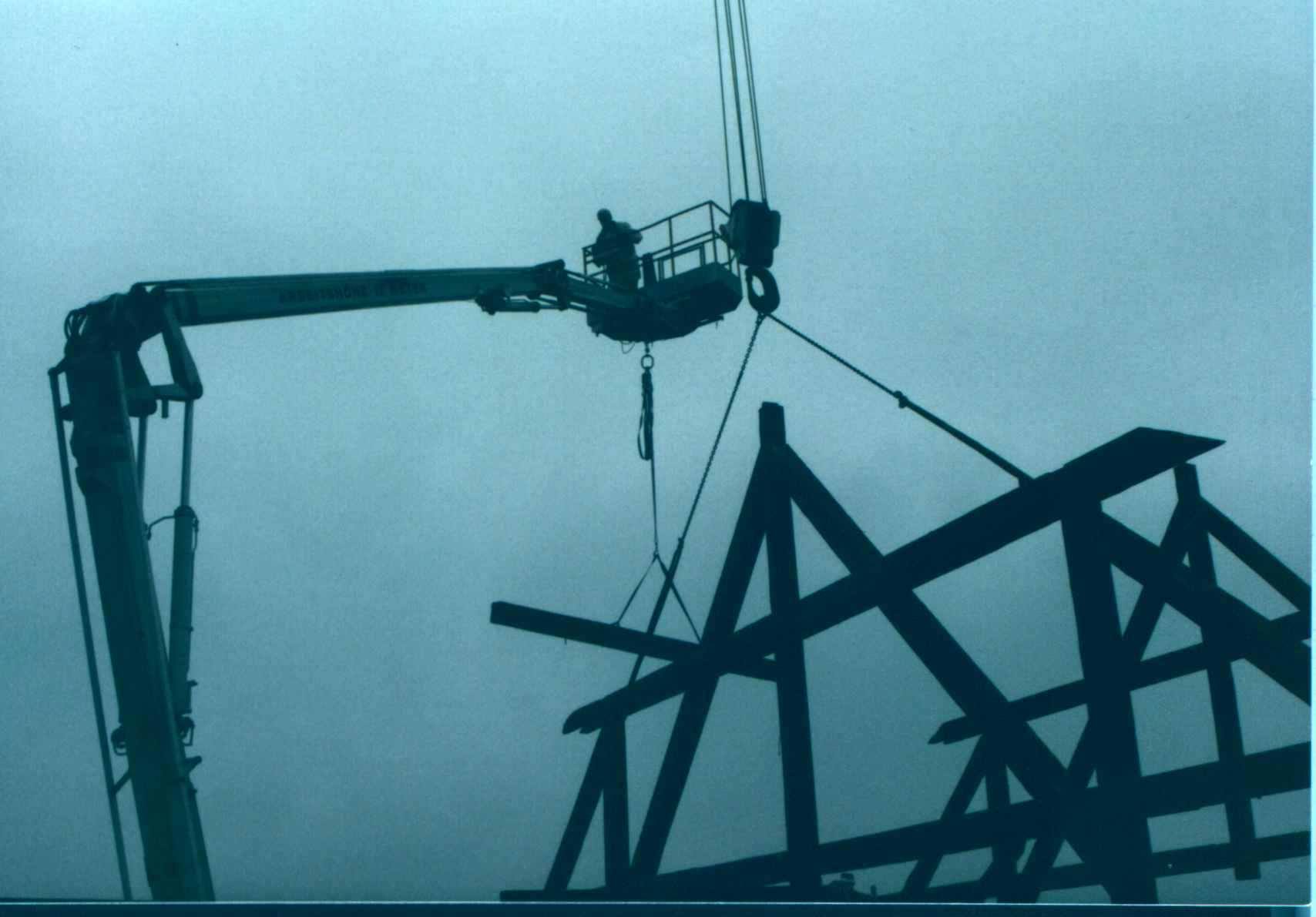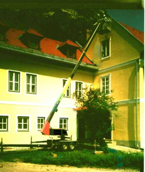 Kranarbeiten auf engstem Raum Aufstockung eines Wohnhauses Auslichten v Alleebäumen