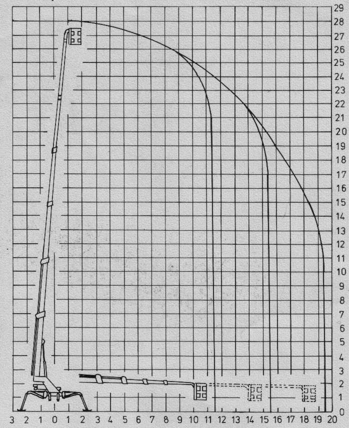 Teleskop 28 Meter 19 Meter 360 Grad endlos 128 x 83 cm, und 78 x 80 cm 215 kg 4 x hydr. Gelenkbeine min 78 cm Breite x 196 cm Höhe 4.300 kg 230 V, Diesel, Akku, Ladegerät eingebaut Untergründe bis 20% Neigung |